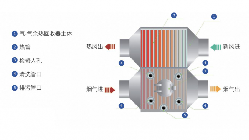 v 余熱回收裝置可控制熱管管壁溫度高于露點溫度,具有良好的抗低溫腐蝕能力;