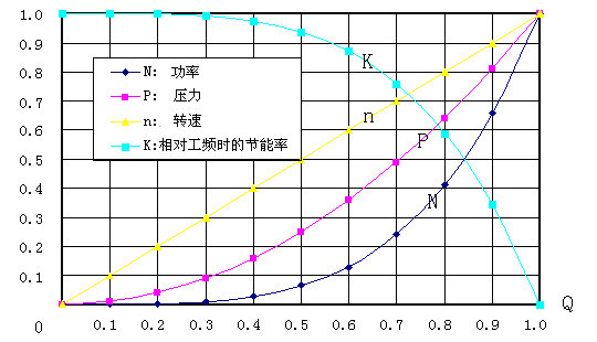 上式表明,風(fēng)機(jī)、水泵的用量Q與其轉(zhuǎn)速n成正比,水泵的揚(yáng)程H與其轉(zhuǎn)速n的平方成正比,風(fēng)機(jī)、水泵的軸功率N與其轉(zhuǎn)速n的立方成正比。頻率與轉(zhuǎn)速的關(guān)系為n=60f(1-s)/p