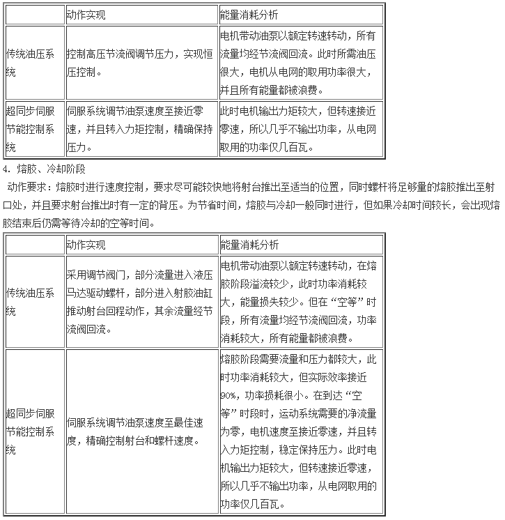 注塑機(jī)的用電量主要消耗在油泵電機(jī)上,在定量泵的液壓系統(tǒng)中,電機(jī)以50Hz高速運(yùn)轉(zhuǎn),油泵的供油量基本不變,遠(yuǎn)遠(yuǎn)大于注塑機(jī)工況的時間要求,多余的高壓油經(jīng)溢流閥全部回流至油箱,能量存在巨大的浪費(fèi)。我們可以采用超同步伺服節(jié)能控制系統(tǒng),使注塑機(jī)在不同工作階段伺服電機(jī)輸出功率,根據(jù)負(fù)載變化而變化,不存在多余能量浪費(fèi)。保壓和冷卻階段,能耗低級,幾乎為零。