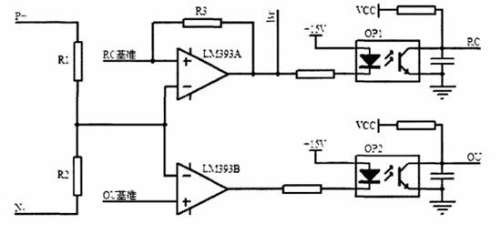3. 由于抽油機下行時負載性質為位勢負載,抽油機專用節(jié)電器加裝能耗制動功能后恰能適應其工況。當抽油機處于“倒發(fā)電”狀態(tài)時,能量會在直流側電容上迅速積累,電壓會被抬升。為了保證系統(tǒng)的安全,當電壓超過一定門限值時,耗能回路導通,將多余的能量經(jīng)過大電阻消耗掉。P、N表示直流側電壓,RC表示耗能吸收信號,OU表示過壓故障信號。