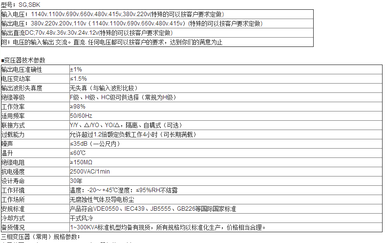 我公司多年來采用優(yōu)質(zhì)材料和先進(jìn)的工藝技術(shù)專業(yè)生產(chǎn) 160VA--600KVA 之間,SG,SBK,TE/F.F/SG系列三相干式隔離變壓器,產(chǎn)品參照國外同類產(chǎn)品最新研制開發(fā)進(jìn)口設(shè)備用變壓器,產(chǎn)品符合 VDE0550 、 IEC439 、 JB5555 、 GB5226 國際、國家標(biāo)準(zhǔn)。SG,SBK,TE/F.F/SG系列三相干式變壓器廣泛適用于交流 50/60HZ ,輸入、輸出電壓不超過500V 的各種供電場合。產(chǎn)品的各種輸入、輸出,電壓高低,聯(lián)接組別,調(diào)節(jié)抽頭位置,繞組容量分配,次級繞組配備,是否要求帶外殼等,均根據(jù)用戶的要求進(jìn)行精心的設(shè)計與制造