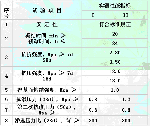 本產(chǎn)品能長(zhǎng)期承受強(qiáng)水壓,在厚50mm,抗壓強(qiáng)度為13.8Mpa的混凝土試件上涂刷兩層該材料,至少可承受123.4m的水壓(1.2Mpa)。