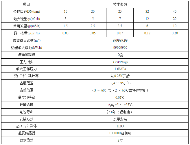 本表將流量計(jì)、積分儀和配對(duì)溫度傳感器集成于一體,其流量計(jì)采用了硬質(zhì)合金加寶石軸承及無(wú)磁傳感器,使其在具有結(jié)構(gòu)緊湊、安裝方便等特點(diǎn)的同時(shí),保證了流量計(jì)的計(jì)量精度和使用壽命,并徹底杜絕了外界磁場(chǎng)對(duì)熱量表計(jì)量精度的影響。本表可根據(jù)用戶(hù)不同需要水平或豎直安裝在進(jìn)水管道或回水管道上(需預(yù)先選定),可旋轉(zhuǎn)的表頭能滿(mǎn)足任何視角的讀數(shù)要求,且冷熱兩用(采暖、制冷) 型熱表可根據(jù)實(shí)際使用情況智能判斷采暖或制冷狀態(tài)并分別進(jìn)行計(jì)量。本表還采用了M-BUS模塊,加入M總線(xiàn)及控制閥后可實(shí)現(xiàn)遠(yuǎn)程自動(dòng)抄表功能,便于集中管理。本表還可配備紅外接口,可用手持自動(dòng)抄表裝置進(jìn)行抄表。