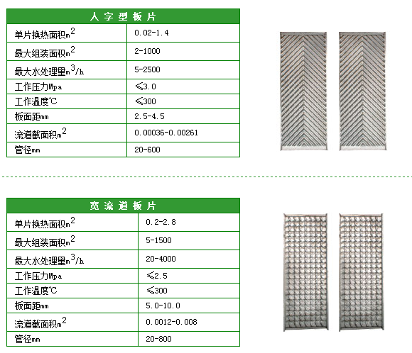 板片束由相鄰兩板片以180度交角交替排列并對合焊接組成流道。流體通過進出口法蘭以錯流式在板片中流動,由于 板片上的曲折波紋,使流體在流道中不斷地轉向,形成紊流,從而大大提高了傳熱效率。