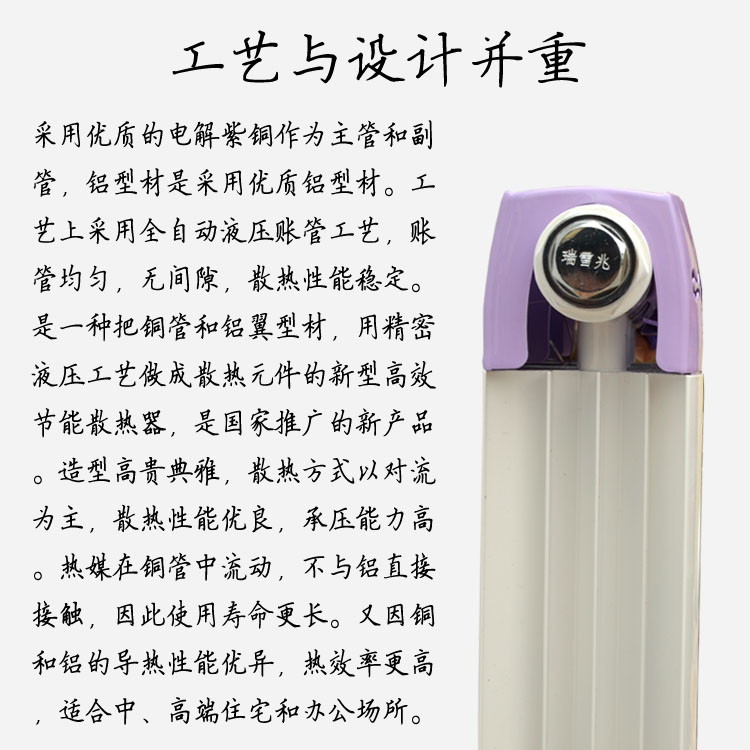 是一種把銅管和鋁翼型材,用精密液壓工藝做成散熱元件的新型高效節(jié)能散熱器,是國(guó)家推廣的新產(chǎn)品。造型高貴典雅,散熱方式以對(duì)流為主,散熱性能優(yōu)良,承壓能力高。熱媒在銅管中流動(dòng),不與鋁直接接觸,因此使用壽命更長(zhǎng)。又因銅和鋁的導(dǎo)熱性能優(yōu)異,熱效率更高,適合中、高端住宅和辦公場(chǎng)所。
