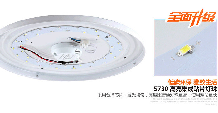 3、吸頂盤芯片采用進(jìn)口高亮5730芯片,發(fā)光效率更高,發(fā)熱量更小,,壓線裝置和玻璃纖維套管。德國VDE認(rèn)證接線端子,人性化的按壓設(shè)計(jì),無需工具,減少煩惱。