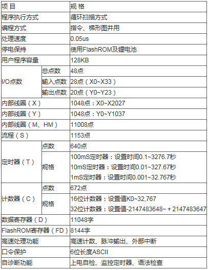 28點(diǎn)NPN型輸入,20點(diǎn)繼電器(R)或晶體管(T)或繼電器晶體管混合(RT)輸出 AC220V(E)電源 最多可外接擴(kuò)展10個(gè)模塊和1塊BD板 具有更高的處理速度 帶時(shí)鐘并對(duì)數(shù)據(jù)進(jìn)行掉電保持 支持基本的邏輯控制和數(shù)據(jù)運(yùn)算 支持高速計(jì)數(shù)、脈沖輸出、外部中斷、電子凸輪、C語言編輯功能塊、I/O點(diǎn)的自由切換、自由格式通訊、MODBUS通訊等功能