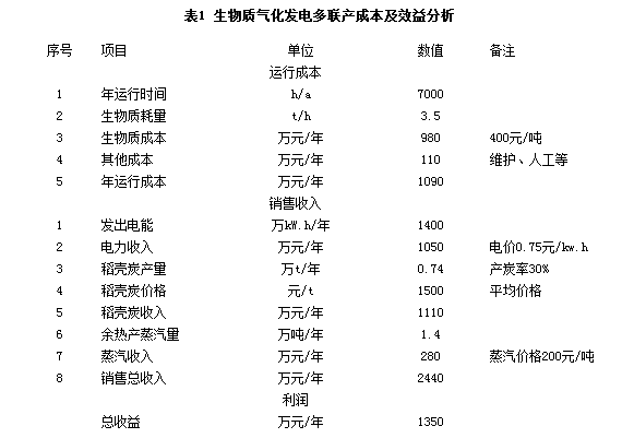 以稻殼為原料為例,建設(shè)1套發(fā)電功率為2MW的生物質(zhì)氣化發(fā)電多聯(lián)產(chǎn)系統(tǒng),運行成本及項目收益見表1。從表中可看出,2MW生物質(zhì)氣化發(fā)電多聯(lián)產(chǎn)項目年獲利超過千萬,利潤豐厚。
