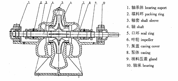 ﹒泵的主要零件有;泵體、泵蓋、葉輪、軸、雙吸密封環(huán)、軸套等。除軸的材料為優(yōu)質(zhì)碳鋼外,其余主零件由鑄鐵、鑄鋼、不銹鋼制成。