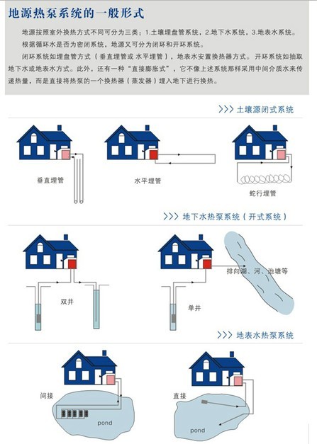 地源熱泵是一種利用地表淺層地?zé)豳Y源(也稱地能,包括地下水、土壤和地表水等攜帶的能量) 的高效節(jié)能空調(diào)系統(tǒng)。該系統(tǒng)集地質(zhì)勘探成井技術(shù)、熱泵技術(shù)和暖通技術(shù)于一體,利用地?zé)豳Y源進(jìn)行采暖和制冷。地源熱泵通過(guò)輸人少量的高品位能源(如電能), 實(shí)現(xiàn)低溫位或高溫位的能量轉(zhuǎn)移。地能分別在冬季作為熱泵供暖的熱源和夏季空調(diào)的冷源,即在冬季,把地能中的熱量“取”出來(lái),提高溫度后,供給室內(nèi)采暖;夏 季,把室內(nèi)的熱量“取”出來(lái),釋放到地能中去。通常地源熱泵機(jī)組的性能系數(shù)COP(指其制熱量與所消耗的電能的比值)達(dá)到3.8-5.4,即消耗1kW的 能量可以得到4kW以上的熱量或制冷量。十幾年來(lái),發(fā)達(dá)國(guó)家對(duì)于地源熱泵技術(shù)多有研究和利用,且不斷發(fā)展,近年來(lái)國(guó)內(nèi)也呈現(xiàn)出不斷研究和使用的趨勢(shì)。據(jù)統(tǒng) 計(jì),至2004年底,淺層地能供暖(冷)系統(tǒng)已在國(guó)內(nèi)推廣近1000萬(wàn)平方米。由于地源熱泵是利用地球表面淺層地?zé)豳Y源(通常小于400米)作為冷熱源而 進(jìn)行能量轉(zhuǎn)換的供暖空調(diào)系統(tǒng)。地表淺層又是一個(gè)巨大的太陽(yáng)能集熱器,它不受地域、資源等限制,真正是量大面廣、無(wú)處不在。這種儲(chǔ)存于地表淺層近乎無(wú)限的能 源,使得地能成為清潔的可再生能源。地表淺層地?zé)豳Y源的溫度一年四季相對(duì)穩(wěn)定,在我國(guó)華北地區(qū),它在冬季比環(huán)境空氣溫度高,夏季比環(huán)境空氣溫度低,是很好 的熱泵熱源和空調(diào)冷源。這種溫度特性使得地源熱泵比傳統(tǒng)空調(diào)系統(tǒng)運(yùn)行效率要高出許多,因此可以節(jié)約能源和節(jié)省運(yùn)行費(fèi)用。另外,地能溫度較恒定的特性,使得 熱泵機(jī)組運(yùn)行更可靠、穩(wěn)定,也保證了系統(tǒng)的高效性和經(jīng)濟(jì)性。地源熱泵系統(tǒng)可供暖、制冷,還可供生活熱水,一機(jī)多用,初投資相對(duì)較少,一套系統(tǒng)可以替換原來(lái) 的鍋爐和空調(diào)兩套裝置或系統(tǒng);可應(yīng)用于各種建筑中。換原來(lái)的鍋爐和空調(diào)兩套裝置或系統(tǒng);可應(yīng)用于