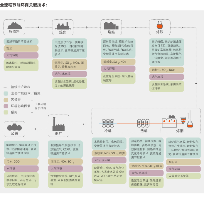 采用了一系列重要節(jié)能減排措施,如:干熄焦技術(shù)、焦?fàn)t煤調(diào)濕技術(shù)、燒結(jié)礦顯熱回收技術(shù)、燒結(jié)煙氣余熱回收技術(shù)、高爐余壓發(fā)電技術(shù)、高爐富氧大噴煤技術(shù)、轉(zhuǎn)爐煤氣凈化與回收技術(shù)、燃?xì)? 蒸汽聯(lián)合循環(huán)發(fā)電技術(shù)等等。