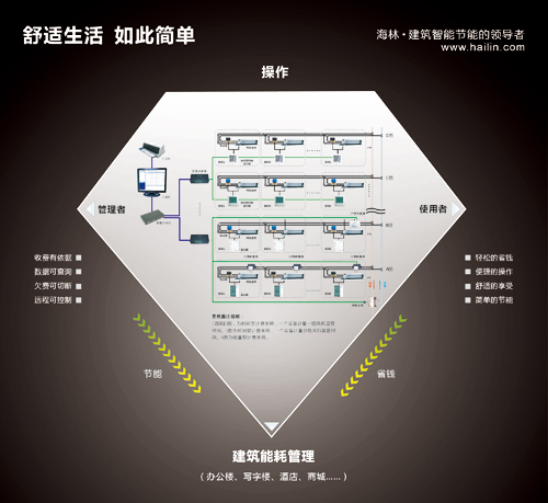 利用強大的建筑節(jié)能智能控制技術(shù),通過互聯(lián)網(wǎng)將中央空調(diào)節(jié)能系統(tǒng)、供熱采暖節(jié)能系統(tǒng)、太陽能熱水系統(tǒng)、地源熱泵、燈光系統(tǒng)、電梯、雨水收集、空氣質(zhì)量、余熱利用等集成為一個綜合節(jié)能系統(tǒng),實現(xiàn)對每個區(qū)域甚至每個房間舒適度調(diào)節(jié)、節(jié)能控制及能耗管理。
