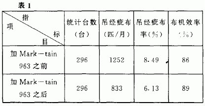 3.1.1由于靜電消除不良,1 15布機(jī)生產(chǎn)“T/J i×45 llO×75 63”細(xì)布的梭口處纖維糾纏極為嚴(yán)重,導(dǎo)致嚴(yán)重的吊經(jīng)及三跳疵點(diǎn),在其它漿料成份未變的情況下,使用Mark—tain963,效果非常明顯,吊經(jīng)疵布率由8.49下降到6.13,三跳疵點(diǎn)也大幅下降,在采用其他相關(guān)措施之后,吊經(jīng)疵布率下降到了2.O3,布機(jī)效率由86上升到了89的水平。見表1。