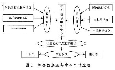 綜 合信息服務中心運用系統(tǒng)工程理論將交通流誘導技術、差分GPS定位技術、GIS及地圖匹配技術、公共交通運營優(yōu)化及評價技術、計算機網(wǎng)絡技術、數(shù)據(jù)庫技 術、通信技術、電子技術等集成為先進的交通信息管理系統(tǒng)。綜合信息服務中心的基本工作原理(見圖1)可以描述為:通過GPS,GSM移動通信技術進行數(shù)據(jù) 和信息采集,結合居民出行調查、路網(wǎng)信息等靜態(tài)信息,以GIS為操作平臺,對信息進行智能整合和優(yōu)化,實現(xiàn)出租車的智能調度和指揮,降低出租車的空載率, 節(jié)約出行者的等待時間,進而達到提高城市公共交通運營效率的目的。