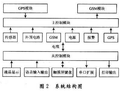 GPS系統(tǒng)是由控制中心和車載監(jiān)控終端兩大部分構成,兩部分之間采用GSM蜂窩網(wǎng)無線數(shù)字雙向通訊方式。GPS/GSM衛(wèi)星定位車載系統(tǒng)由兩大部分組成: 主控制單元和從控制單元。主控制單元包括:傳感器檢測及外圍電路、電源模塊、GSM模塊、GPS模塊、報警模塊。從控制單元包括:液晶顯示模塊、語音輸入 /輸出單元、觸摸屏鍵盤、串口擴展、打印輸出。GPS車載移動終端系統(tǒng)結構框圖如圖2所示。