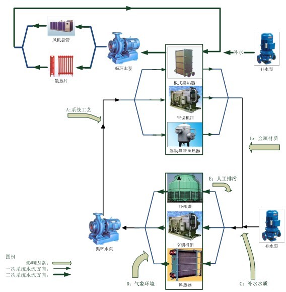 C:補(bǔ)水水質(zhì).系統(tǒng)的補(bǔ)水中含有一定量的懸浮物、膠體及溶解性物質(zhì)(如鈣鎂離子、氯根、硫酸根等等)。這些物質(zhì)隨著補(bǔ)水進(jìn)入到循環(huán)水系統(tǒng),造成系統(tǒng)的腐蝕、結(jié)垢及菌藻滋生等水質(zhì)問(wèn)題。補(bǔ)水水質(zhì)一般是在一定的范圍內(nèi)波動(dòng),從水處理的角度分析屬于動(dòng)態(tài)影響因素。