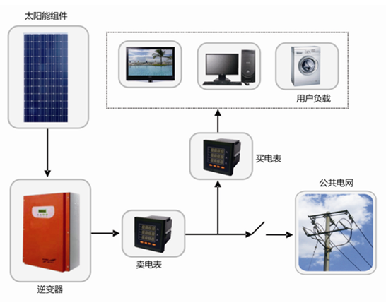 戶用型并網(wǎng)方案適用于家庭自用光伏發(fā)電,供家用電器等負(fù)載使用,并將其剩余電能饋送至公共電網(wǎng)中。在電網(wǎng)穩(wěn)定的地區(qū),可以不使用蓄電池。