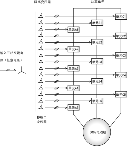 HY高壓變頻器由多個(gè)功率單元串聯(lián)而成,各個(gè)功率單元由輸入隔離變壓器的二次隔離線圈分別供電。功率單元為交-直-交結(jié)構(gòu),相當(dāng)于一個(gè)三相輸入、單相輸出的低壓電壓源型變頻器,所有功率單元在結(jié)構(gòu)以及電氣性能上完全一致,維護(hù)簡(jiǎn)單,置換方便。