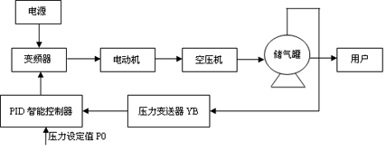 我們可以把管網(wǎng)壓力作為控制對象,壓力變送器YB將儲氣罐的壓力P轉(zhuǎn)變?yōu)殡娦盘査徒oPID智能儀表,與壓力設定值P0作比較,并根據(jù)差值的大小按既定的PID控制模式進行運算,產(chǎn)生控制信號送變頻調(diào)速器VVVF,通過變頻器控制電機的工作頻率與轉(zhuǎn)速,從而使實際壓力P始終接近設定壓力P0。同時,該方案可增加工頻與變頻切換功能,并保留原有的控制和保護系統(tǒng),另外,采用該方案后,空壓機電機從靜止到旋轉(zhuǎn)工作可由變頻器來啟動,實現(xiàn)了軟啟動,避免了啟動沖擊電流和啟動給空壓機帶來的機械沖擊。