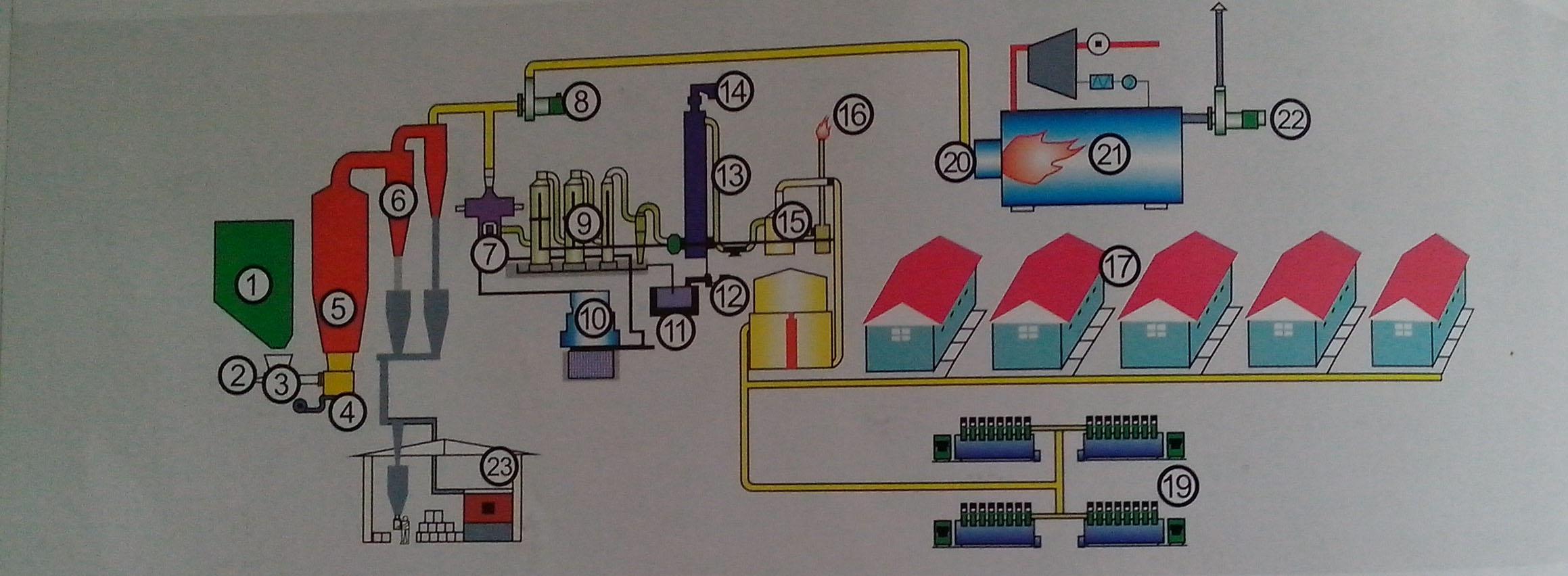 ● 將氣化產(chǎn)生的燃?xì)庥娠L(fēng)機(jī)輸送到貯氣柜,再經(jīng)過管網(wǎng)送入用戶的專用煤氣灶前