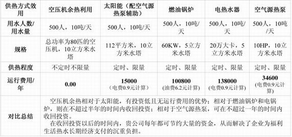 螺桿空壓機余熱利用系統(tǒng)與其它熱水系統(tǒng)經(jīng)濟效益對比(500人用水為例)