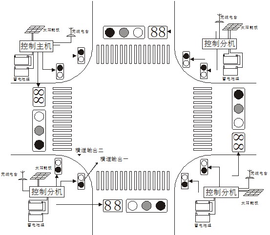 利用HD205信號(hào)機(jī)構(gòu)成的一個(gè)標(biāo)準(zhǔn)十字太陽能信號(hào)燈路口示意圖如下所示,可以看出,一個(gè)路口可以分解成4個(gè)街角,采用HD205A信號(hào)機(jī)組成的信號(hào)燈路口完全避免了機(jī)動(dòng)車車道的路面開挖。