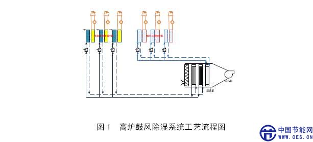 采用冷凝法除濕,入熱風(fēng)爐的空氣采用脫濕技術(shù)工藝,將進(jìn)入鼓風(fēng)機之前的濕空氣先行預(yù)冷,接著將預(yù)冷后的濕空氣通過表冷器冷卻,使其溫度降低到空氣含濕量對應(yīng)的飽和溫度以下,濕空氣中的多余飽和量的水份凝結(jié)析出,再經(jīng)過除水器排出,使空氣中含水量降低。