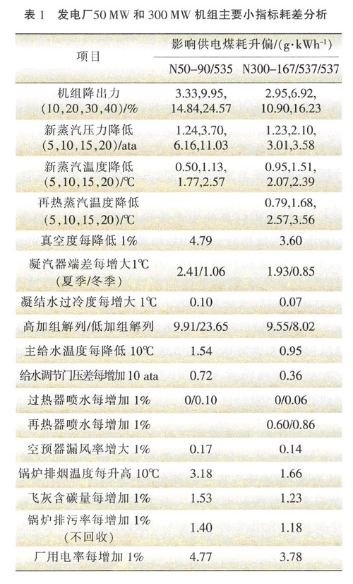 開展運(yùn)行指標(biāo)競(jìng)賽是發(fā)電廠運(yùn)行工作中的基礎(chǔ)工作,指標(biāo)競(jìng)賽可以充分調(diào)動(dòng)運(yùn)行人員的工作積極性,指標(biāo)競(jìng)賽直接關(guān)系到機(jī)組經(jīng)濟(jì)效益。發(fā)電廠可根據(jù)自 己的實(shí)際情況制訂切實(shí)可行的機(jī)組小指標(biāo)競(jìng)賽管理辦法,做好運(yùn)行的基礎(chǔ)管理工作,表1提供了50MW和300MW機(jī)組的主要小指標(biāo)耗差分析,僅供參考。