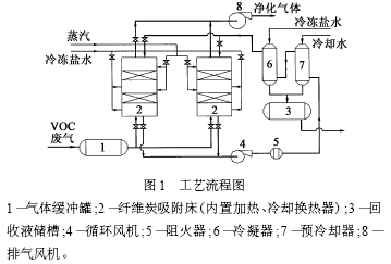 本工藝以吸附2冷凝回收原理為基礎(chǔ),采用集成加熱器和冷卻器功能的新型吸附床纖維活性炭,在凈化廢氣的同時(shí),回收了大量的VOC 溶劑,使環(huán)保投入產(chǎn)生了較好的經(jīng)濟(jì)效益和環(huán)境效益。在此以某精細(xì)化工廠尾氣處理工程為例,介紹該工藝。