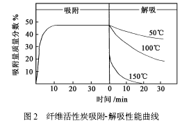 目前活性炭產(chǎn)品中,以纖維活性炭性能最佳,蜂窩活性炭次之,而顆?;钚蕴吭俅?。本工藝采用纖維活性炭為吸附劑,由于吸附劑的吸附2脫附性能是確定本工藝的關(guān)鍵因素,而廠家提供的有關(guān)參數(shù)存在不詳、失實(shí)問題。因此針對(duì)類似工況作纖維活性炭性能的實(shí)驗(yàn)室研究,結(jié)果見圖2。
