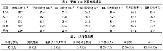 (3) 回收裝置投入運(yùn)行10 個(gè)月累計(jì)回收甲苯108 t ,四氫呋喃136 t ,回收液體直接回用作生產(chǎn)原料,節(jié)約生產(chǎn)成本約135 萬元。預(yù)計(jì)每年經(jīng)濟(jì)效益可達(dá)162 萬元。
