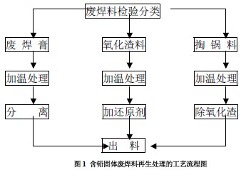 圖1 是含鉛固體廢焊料再生處理的工藝流程圖。按圖所示,首先要對廢焊料進行檢驗分類,并對廢焊膏、廢氧化渣和掏鍋料分別采用不同的工藝進行回收處理。