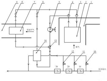 1為尾部煙道,2為煙氣冷卻器,3為進(jìn)口集箱,4為出口集箱,5為循環(huán)水泵,6為給水加熱器閘閥,7為空氣加熱器,8為空氣加熱器閘閥,9為風(fēng)道,10~12為低壓加熱器分水調(diào)節(jié)閥,13為余熱利用導(dǎo)向閥,14為給水加熱器。