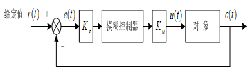 計(jì)算機(jī)實(shí)現(xiàn)模糊控制算法進(jìn)行模糊控制時(shí),將每次采樣所得數(shù)據(jù)經(jīng)計(jì)算機(jī)處理,成為模糊控制器的輸入變量。為實(shí)現(xiàn)模糊化處理,將輸入變量的基本論域乘以相應(yīng)的 量化因子轉(zhuǎn)換到相應(yīng)的模糊集的論域,再將模糊控制算法給出的控制量乘以因子,將其轉(zhuǎn)換到控制對(duì)象能夠接受的基本論域。設(shè)偏差的量化因子為,偏差變化的量化因子為,輸出變量的比例因子為,偏差和偏差的變化分別量化為和,輸出變量為。一維模糊控制系統(tǒng)示意圖如圖2.3所示: