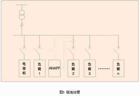 ?。?)就地治理適用于諧波源比較明確且單臺設(shè)備諧波含量較大的配電系統(tǒng),比如大型商業(yè)區(qū)的景觀照明、影劇院的可控硅調(diào)光設(shè)備、工業(yè)區(qū)的變頻器調(diào)速設(shè)備等,單臺設(shè)備電流大、諧波含量高、諧波電流大,為防止諧波電流影響其他用電設(shè)備,采用就地治理,如圖5所示:
