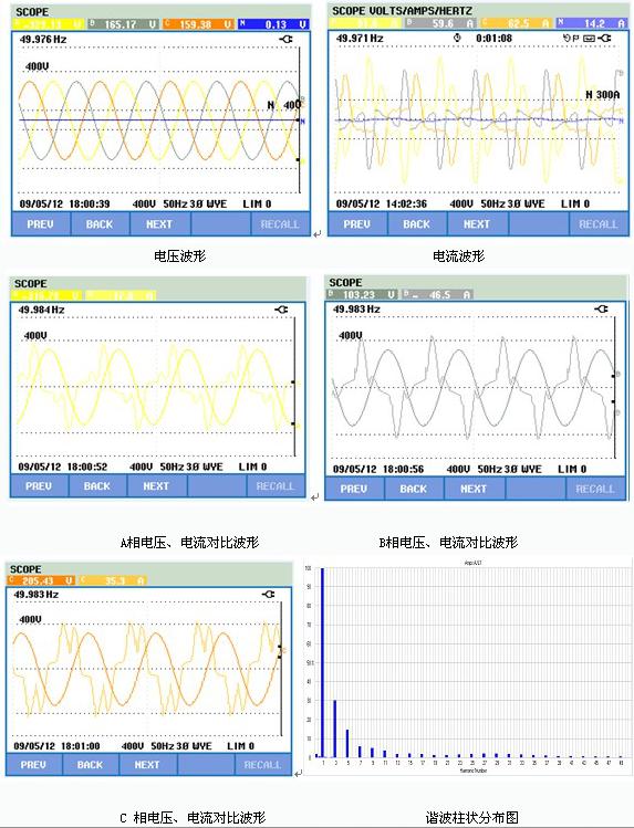 具體測量情況如下:測量點1 :北燈光站進線乙的變壓器低壓側(cè),電容柜投切前后,實時測量 1 級光至 5 級光時的情況;測量點2 :滑行道中線燈回路 3 調(diào)光器進線側(cè),實時測量 1 級光至5 級光的情況;測量點3 :北燈光站進線甲的變壓器低壓側(cè),電容柜投切前后,實時測量 1 級光至 5 級光的情況;測量點4 :跑道邊燈回路2 調(diào)光器的進線側(cè),實時測量 1 級光至 5 級光的情況;1)主要諧波源——調(diào)光器(以測量點1為例)