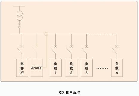 ?。?)集中治理適用于單臺設(shè)備諧波含量小,但數(shù)量龐大、布局分散的場合,比如辦公大樓(個人電腦、節(jié)能燈、變頻空調(diào)、電梯等),雖然單臺設(shè)備的電流小,諧波含量低,但整棟大樓的電流大,諧波電流也大,如圖3所示: