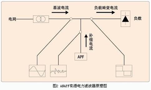 3.2諧波治理方案安科瑞ANAPF系列有源電力濾波器,以并聯(lián)方式接入電網(wǎng),通過實時檢測負(fù)載的諧波和無功分量,采用PWM變流技術(shù),從變流器中產(chǎn)生一個和當(dāng)前諧波分量和無功分量對應(yīng)的反向分量并實時注入電力系統(tǒng),從而實現(xiàn)諧波治理和無功補償,如圖2所示: