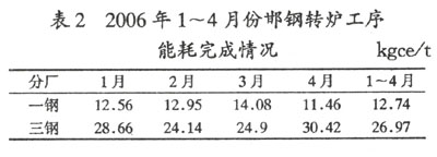 表2為邯鋼一、三鋼2006年1~4月份轉(zhuǎn)爐工序能耗完成情況。