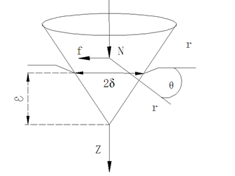 在砂漿線切割硅棒過程中,碳化硅顆粒在硅棒和鋼線之間進(jìn)行“滾動(dòng)-壓痕”作用,實(shí)現(xiàn)材料的去除[2]。舒繼千等[3]對(duì)切割機(jī)理進(jìn)行了詳細(xì)闡述,包括單顆粒滾動(dòng)-壓痕模型、多顆粒壓痕效應(yīng)模型及彈性-流體效應(yīng)模型。將瑜等人[4]對(duì)單顆粒模型的切割力進(jìn)行模擬計(jì)算,見圖1。由圖得出法向切割力N的計(jì)算公式