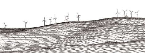 在許多國(guó)家陸上風(fēng)電場(chǎng)所造成的視覺(jué)影響是一個(gè)很重要的議題,尤其是在那些人口密集度很高的地區(qū)。使用計(jì)算設(shè)計(jì)軟件可以計(jì)算出相關(guān)的視覺(jué)影響區(qū)域(ZVI) 或者是視覺(jué)足跡(visibility footprint)。通常來(lái)講,如果從所處位置可以看到風(fēng)機(jī)的半個(gè)輪轂或整個(gè)輪轂或單個(gè)葉片尖的話,還不足以稱該風(fēng)電場(chǎng)已經(jīng)產(chǎn)生了視覺(jué)影響。在風(fēng)電場(chǎng)布 局的過(guò)程中,一般會(huì)采用單面線框模式繪制地形圖,用以凸顯指定角度所看到的風(fēng)電場(chǎng)的視覺(jué)效果,如下圖所示。該效果圖也可以進(jìn)一步以蒙太奇照片的形式展現(xiàn), 蒙太奇照片中從指定角度所看到的風(fēng)電機(jī)組被有層理地排列。
