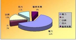 我國建筑物單位能耗很高,與氣候條件相近的發(fā)達國家相比,我國建筑物單位能耗是他們的2~5倍。水、電、空調(diào)、蒸汽、醫(yī)療氣體作為維持醫(yī)院運作之基本要 素,其中以電力和醫(yī)療氣體最重要,若二者之一中斷,便會立刻危害到病患的生命,所以公用系統(tǒng)為醫(yī)療作業(yè)之命脈。系統(tǒng)設備以安全、可靠度為首要要求,但是公 用系統(tǒng)亦為主要能源耗用設備,必須妥善管理以確保安全,并兼顧節(jié)約能源。在醫(yī)院能耗中,電力約占64%,為整個醫(yī)院之主要能源,瓦斯、重油等約占11%, 主要用在供應蒸汽、熱水、消毒、洗縫、廚房及冬季暖氣,其中如以電力再分析如圖二,空調(diào)約占50%,照明、插座約占34%,所以空調(diào)、照明為醫(yī)院節(jié)能管理 重點。