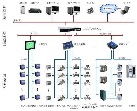 站控管理層針對能耗監(jiān)測系統(tǒng)的管理人員,是人機交互的直接窗口,也是系統(tǒng)的最上層部分。主要由系統(tǒng)軟件和必要的硬件設備,如工業(yè)級計算機、打印機、 UPS 電源等組成。監(jiān)測系統(tǒng)軟件具有良好的人機交互界面,對采集的現(xiàn)場各類數(shù)據(jù)信息計算、分析與處理,并以圖形、數(shù)顯、聲音等方式反映現(xiàn)場的運行狀況。