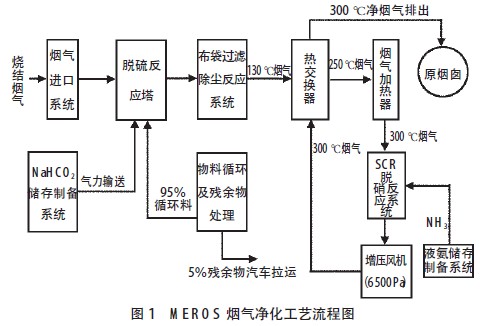 西門子奧鋼聯公司MEROS+SCR 脫硫脫硝工 藝流程見圖1,西門子奧鋼聯MEROS 系統(tǒng)煙氣凈化 效果見表1。