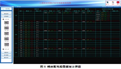 (4)樓層配電箱數(shù)據(jù)采集及顯示(如圖5所示):樓層電能管理主機(jī)采集1788中心B3F~30F各處配電箱上儀表的數(shù)據(jù),以樓層劃分,按照配電箱所處位置和編號對數(shù)據(jù)進(jìn)行排序,分類顯示租戶、空調(diào)和風(fēng)機(jī)回路的三相電流和有功電度,顯示照明、應(yīng)急照明、動力、電梯、水泵和一些其他回路的三相電流。