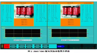 ?。?)35kV、10kV變壓器參數(shù)顯示:如圖2所示,電能管理系統(tǒng)采集1788中心配電系統(tǒng)35kV側(cè)和10kV側(cè)的三相相電壓、三相線電壓、三相電流、總有功功率、總無功功率、總功率因數(shù)和有功電度累積值,將其35kV側(cè)和10kV側(cè)的數(shù)據(jù)列在一起,方便值班人員進(jìn)行比對和檢查。通過干式變壓器溫度控制采集的變壓器三相溫度也同時以數(shù)值和曲線的形式反映在本界面上。
