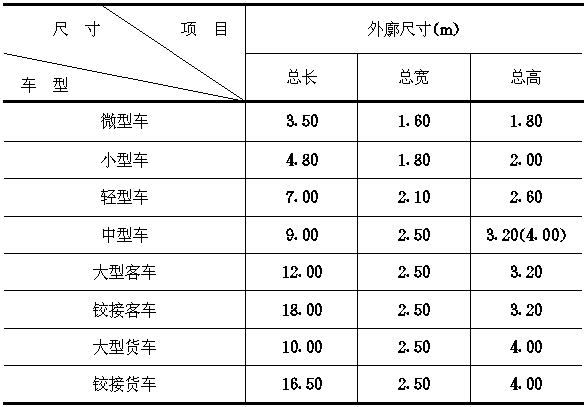 4.1.1 公用汽車庫(kù)中汽車設(shè)計(jì)車型的外廓尺寸可按表4.1.1的規(guī)定采用。