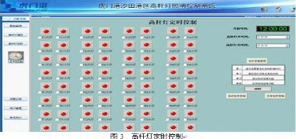 本系統(tǒng)實(shí)現(xiàn)對虎門港碼頭32桿高桿燈(64只燈泡)進(jìn)行遠(yuǎn)程定時(shí)及手動(dòng)控制,在正常情況下,系統(tǒng)將會(huì)按照管理員所設(shè)定時(shí)間對高桿燈自動(dòng)進(jìn)行點(diǎn)亮及熄滅操作,提高了碼頭照明的及時(shí)性、同步性、合理性;同時(shí)系統(tǒng)還具有遠(yuǎn)程手動(dòng)控制,避免了因天氣多變帶來的碼頭照明問題,提高了操作的靈活性,大大降低了電能的浪費(fèi),保證了資源的合理利用。圖3為高桿燈控制畫面。