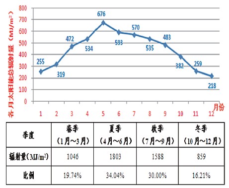 唐山市年太陽輻射量為5296MJ/m2,夏季和秋季的太陽