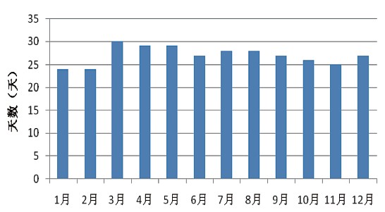 圖2 全年各月日照時數(shù)大于等于6小時的天數(shù)